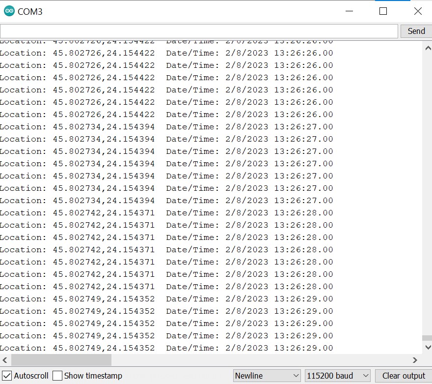 Dupa realizarea conectaxiunii necesare cu satelitii GPS, in Serial Monitor se vor afisa ora (in format Greenwich Mean Time (GMT+0), coordonatele modulului data curenta: