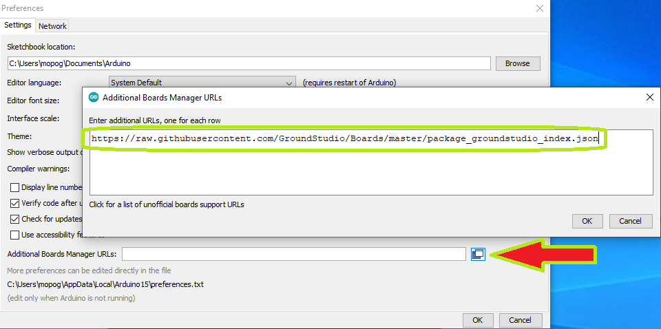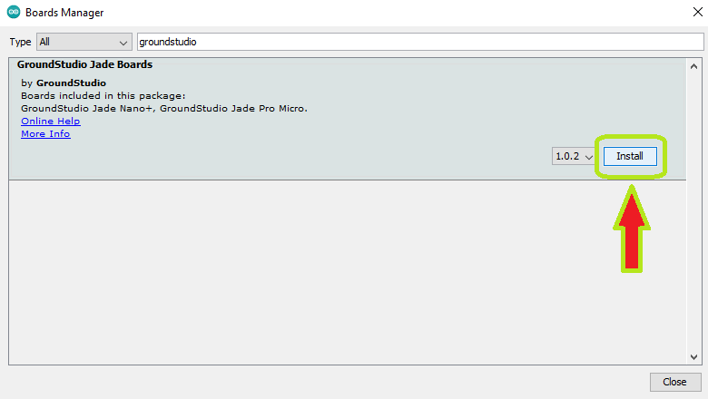 In "File->Preferences->Aditional Boards Manager URLs:" adaugati linkul urmator: "https://raw.githubusercontent.com/GroundStudio/Boards/master/package_groundstudio_index.json".
