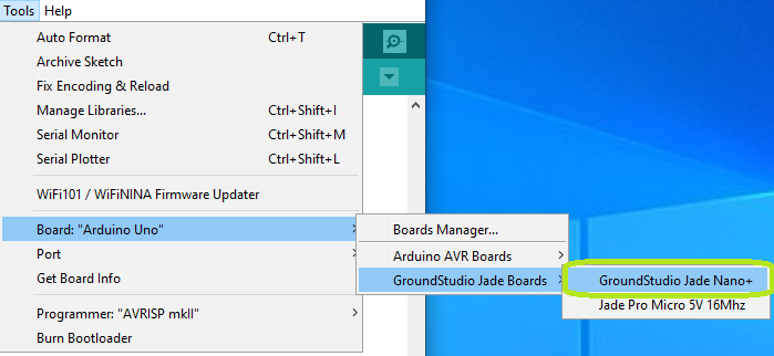 Dupa instalare, veti avea disponibil in meniul "Tools" board-ul "GroundStudio Jade Nano+"