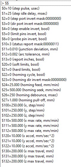 - Fisierul "cod4GrblController.txt" a fost testat cu urmatoarele setari din Grbl Controller. Pentru a vedea setarile de pe shield-ul dvs. tastati $$ in linia de "Command" a aplicatiei Grbl Controller.